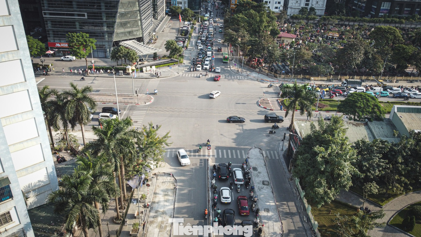 Ghi nhận của phóng viên Tiền Phong ngày 31/12, tại nút giao Lê Văn Lương - Hoàng Minh Giám - Nguyễn Tuân, các đơn vị thi công đang huy động tối đa nhân lực để hoàn thiện những công đoạn cuối cùng. Phần mặt đường mở rộng sau khi xén vỉa hè đã cơ bản được thảm nhựa asphalt.