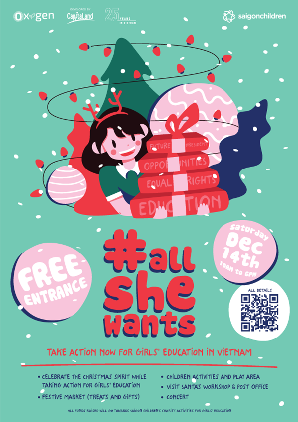Trong thời gian diễn ra chiến dịch, saigonchildren còn phối hợp cùng CapitaLand Việt Nam tổ chức sự kiện #allshewants vào ngày 14-12 tại The Oxygen (The Vista, Quận 2, Tp. Hồ Chí Minh). Đây là sự kiện cộng đồng với các hoạt động được thiết kế cho cả người lớn lẫn trẻ em nhằm nâng cao tính tìm tòi, sáng tạo, sự tự tin, và truyền cảm hứng cho các em, đặc biệt là các bé gái. Sự kiện còn bao gồm nhiều trò chơi và lớp học, những buổi chia sẻ kinh nghiệm từ các nhà nữ lãnh đạo, và một chương trình biểu diễn ca nhạc với nhiều chương trình hấp dẫn.