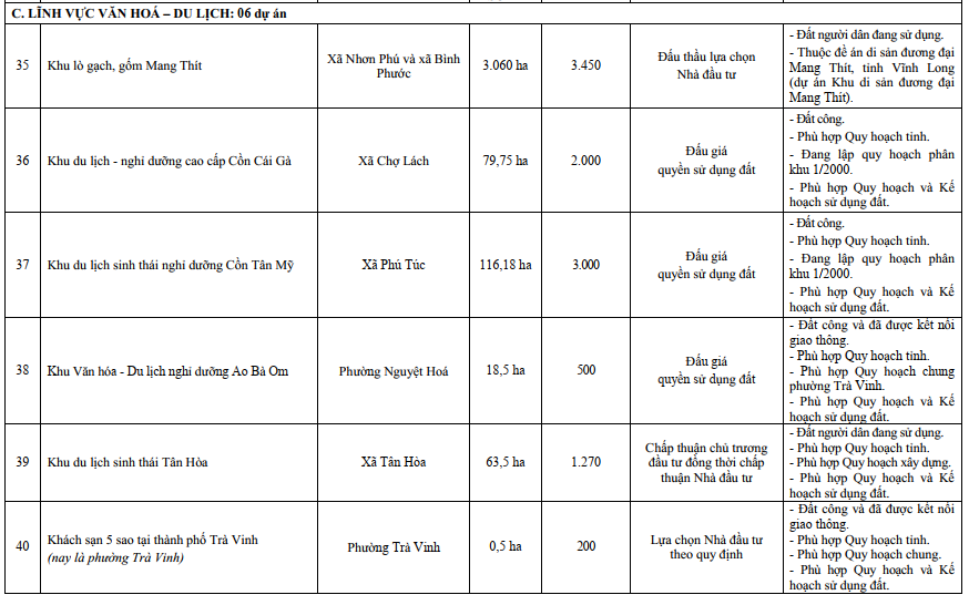 Trong đó, trục dự án tại Cồn Cái Gà, Cồn Tân Mỹ và Tân Hòa cho thấy trọng tâm phát triển các mô hình du lịch sinh thái – trải nghiệm, dựa trên quỹ đất ven sông và địa hình cù lao. Đây là đặc điểm nổi bật của Vĩnh Long so với nhiều địa phương trong khu vực, phù hợp xu hướng du lịch lưu trú dài ngày và khai thác cảnh quan tự nhiên.